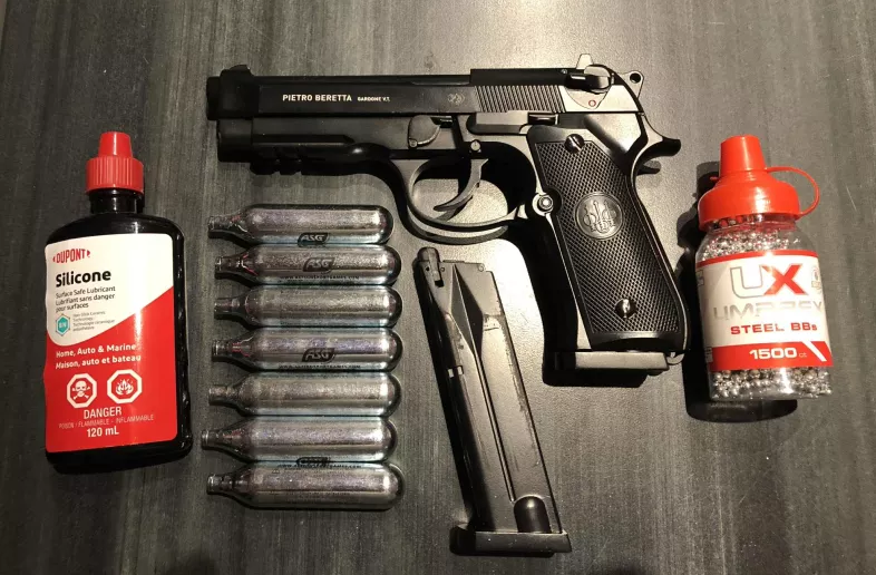 Beretta 92A1 BB Gun, .177 cal. (Umarex) Full blowback. Spare magazine, 16x 12 gram co2 cartridges, lube for seals, approx 1000 bbs. Exact replica, most realistic on the market. All metal, same weight as actual Beretta. Semi auto single shot or full auto. Full auto is all 18 bbs in 2 seconds, not burst of 3 like the cheap ones (Crossman etc.) see video. Over $300 paid, sell for $250, shipping included.
