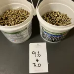 Two buckets of Remington 22 as you see in the pics. The full one weighs 9.6 pounds and the partial is 7.0. 1400 rounds in the full one so the arithmetic says about 2400 rounds. Say 2000 just to be conservative. My Ruger 10/22 does not like it. Running CCI only now.