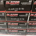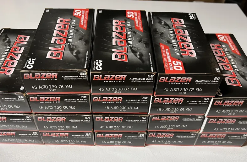 18 boxes of Blazer Aluminum case 230gr FMJ ammo. $30 per box or all 900 rounds for $500.