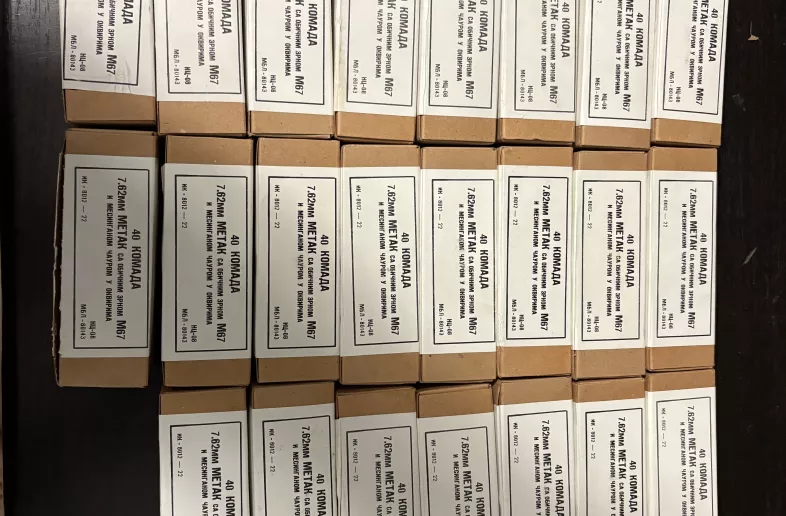22 boxes of Yugo m67 ammo. There are 4 stripper clips of 10 rounds in each box, totaling 880 rounds. Bought them from Bullseye North in the same can, all from the same lot. Only 1 box was opened for the picture. They are all stored in my ammo safe with a dehumidifier. They were made in 1980 from the bottom stamp.