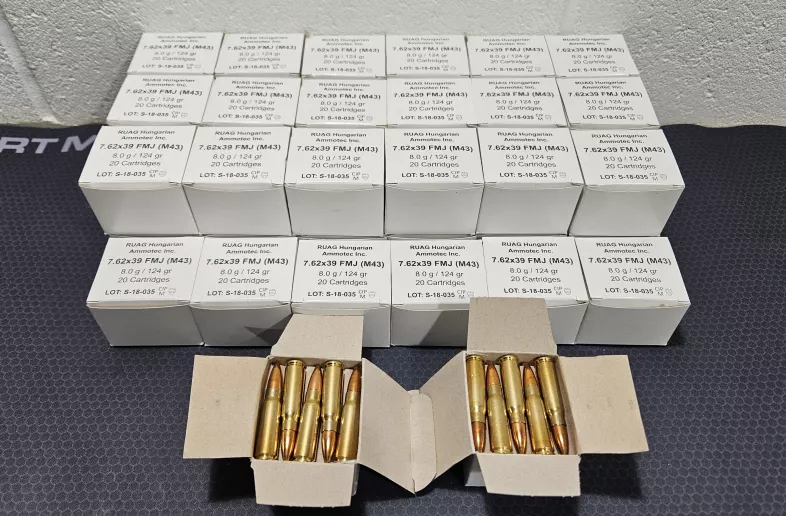 880 Rounds, RUAG GECO 7.62 x 39 Non-Corrosive, Reloadable Brass, Boxer primers.