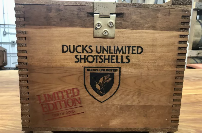 1982 Limited Edition Federal Ducks Unlimited Wooden Box. Contains two individual branded carrying cases holding 8 Boxes of Shotshells