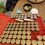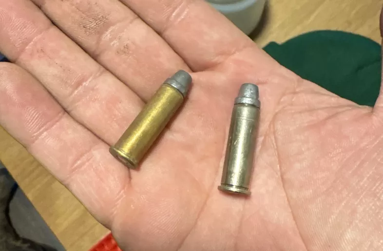 Around 75 loaded rounds off 357 and 38sp, some in this beautiful nickel old cowboy ammo. Around 200+ of brass. 150+ of nickel plated brass.