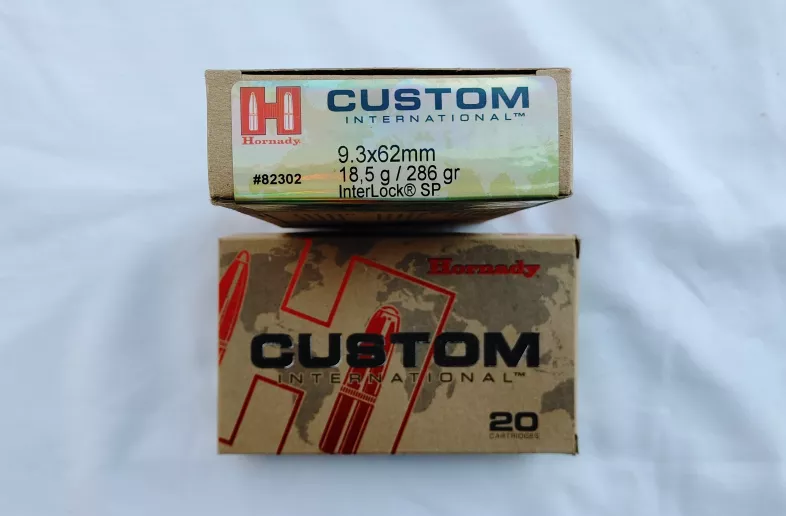 Hornady Custom International 9.3x62, 286 gr Interlock SP. New factory ammo. 20 rounds per box. Selling 2 boxes as one lot for $140 ($70 per box).