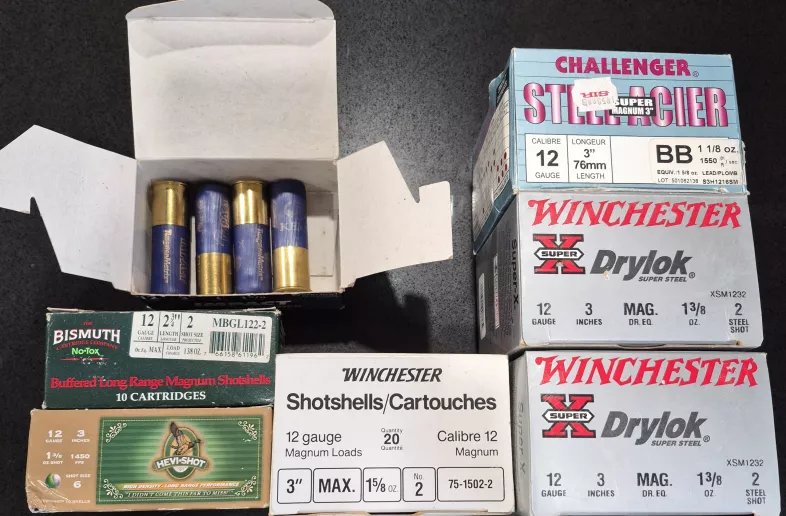 Lot of assorted 12 gauge shells, steel, lead, hevi-shot, bismuth, tungsten matrix