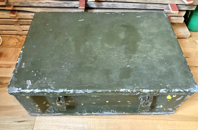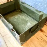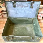 Large metal ammo box, approximately 20x14x8". Paint is worn but no real damage. Aluminum construction I suspect. Solid and rugged storage for whatever you can dream up.
