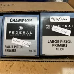 Assorted small and large pistol primers, Federal and Winchester- $12 /100, $110/1000.