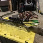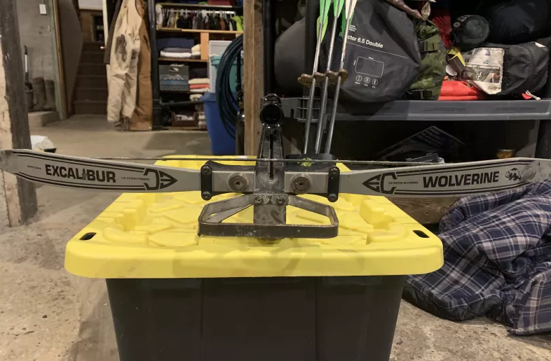 Original excalibur wolverine crossbow package ready to hunt. Bow topped with a Ruko 4x4C wide scope. Package includes excalibur cocking aid, kwikee quiver (3 bolts with broadheads and lumenoks, 2 with target tips), and two strings.