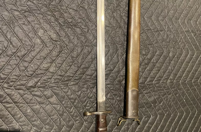 (1) FITS .30-06 CAL. M1917 RIFLES & 12 GAUGE COMBAT SHOTGUNS, RICASSO MARKED: "1913", "7 17" & "REMINGTON" IN CIRCLE, OTHER-SIDE HAS CROSSED OUT MARKINGS: CROWN OVER "C6" OVER "A", "U.S." STAMPED OVER CROWN OVER "??" WITH PARTIAL BROAD ARROW, "X" (BEND TEST) & "U.S.", 2-PIECE WOOD GRIP WITH TWO GROOVES, METAL POMMEL, NO VISIBLE MARKINGS, METAL AND LEATHER SCABBARD WITH METAL BELT HOOKS, LEATHER MARKED: "P", METAL ENDS MARKED: "GF" IN AN OVAL, BLADE APPROX. 17 1/8" & OAL APPROX. 21 7/8".