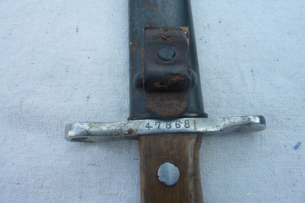 The scabbard is in good condition with the original leather attachment strap included. This bayonet was manufactured by Paillard with their mark stamped on the end of the scabbard.