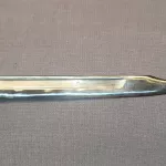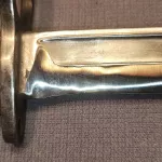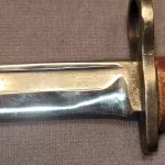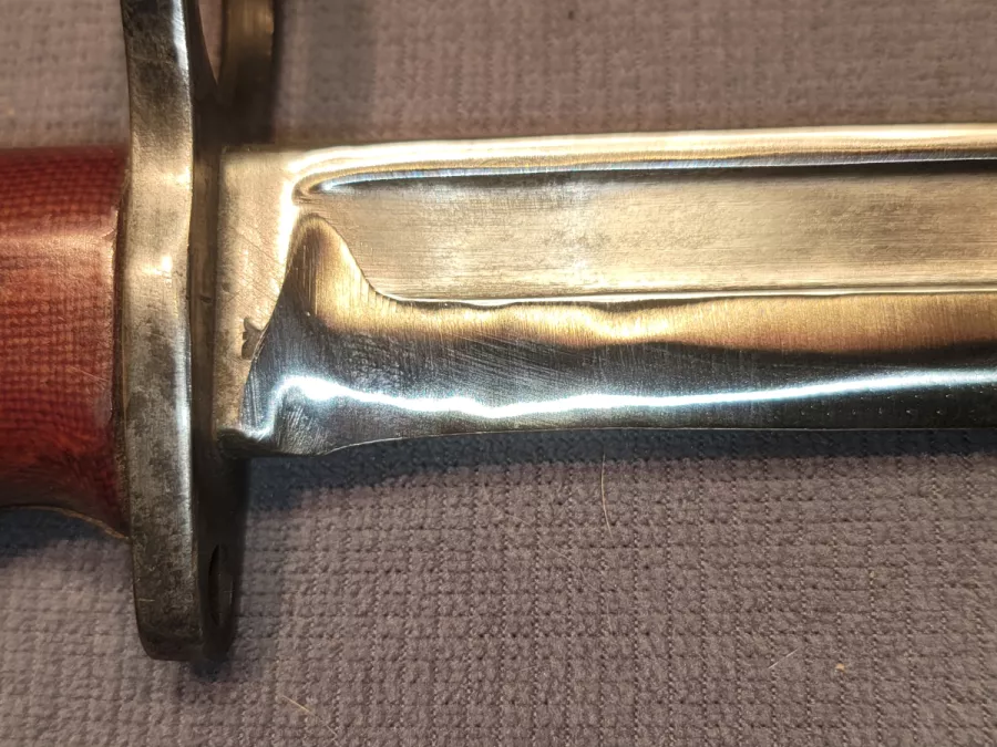 The bayonet is is in excellent to VG condition but the blade has been sharpened and buffed. As such it is missing the bluing line at the base of the fuller and the sharpening has removed some of the fuller there as well. The broad arrow mark is also obscured slightly. Bluing finish is worn at the cross guard from handling and wear but is excellent at the hilt / socket with only slight edge wear.