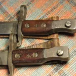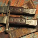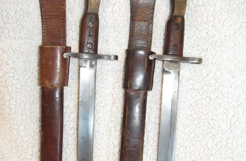 Two Ross rifle bayonets with correct leather scabbards. No rust but some pits, not sharpened and wood grips in various condition…see pics. Don’t believe the scabbards match the bayos but both are correct and have various markings and Mark II on back near bottom. For the bayo’s, they’re marked as shown in various pictures. If you need more photos or clarification on anything, get back to me. Would prefer to sell both together as I no longer know which scab goes with which bayo. Asking $450 plus postage, as package deal for both. Reply to Pete via system mail. PS…these may also be advertised on another Cdn site. Thanks for looking,