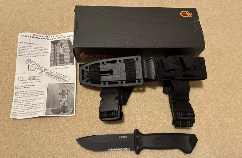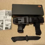 Brand new. 10 inch blade, partially serrated with steel glass breaker and hammer built into knife bottom. Sheath is MOLLE compatible and includes built in blade sharpener and 2 removable leg straps. Lashing holes for use as spear. Made in USA.