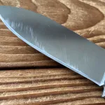 The 4" blade is 154CM steel; known for use in high intensity applications. This stainless steel can take a great edge and hold it long. It has a full flat grind. The 4" handle is G10; known for its durability and good grip when wet. Overall length is 8".