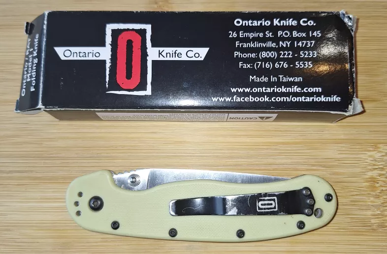 Ontario Rat 1 folder. Satin D2 steel blade, pocket clip has wear marks, otherwise in really nice shape.