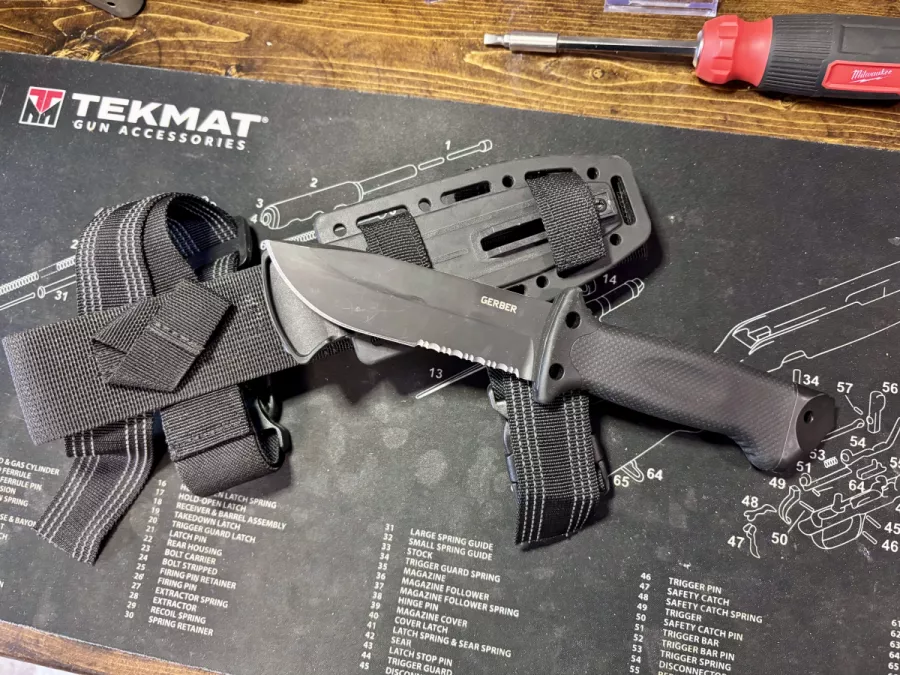 • Gerber LMF II Infantry Knife: Full tang design, partial serration, and rubberized handle.