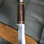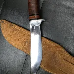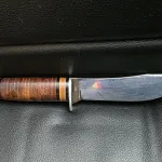 - Handle: It has a classic stacked leather washer handle, a very common and durable design for Schrade fixed blades.
