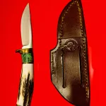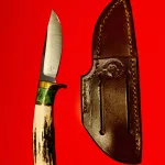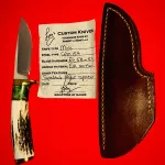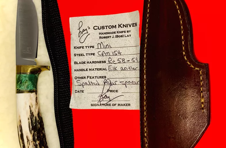 NEW FULL PACKAGE " BOB LAY CUSTOM KNIVES" WORLD RE-KNOWN , MAJOR U.S. MARKET , AMERICAN GUILD MEMBER , WESTERN CANADIAN CUSTOM KNIVE MAKER , 49 YEAR CAREER , MANY BEST IN SHOW AWARD WINNING KNIVES , #1 RARE* MINI 3. in" CPM 154 STEEL HOLLOW GROUND BLADE , MIRROR POLISHED FLATS , ELK HANDLE , BRASS GUARD AND BUTT CAP , STABILIZED SPALTED GREEN ALDER SPACER , THIN LINE BLACK SPACERS FOR TEMPERATURE FLUCTUATIONS , QUALITY HAND MADE LEATHER SHEATH WITH MAKERS STAMP , BY JUDY LAY , HIGH QUALITY CONDURA LINED ZIPPERED POUCH , NEW* NEVER USED SHARPENED CARRIED , ONLY 20/25 KNIVES MADE PER YEAR , VERY SOUGHT AFTER COLLECTABLES , HIGH END KNIVES , HAND MADE ALL NATURAL MATERIAL * $495 emt no trades