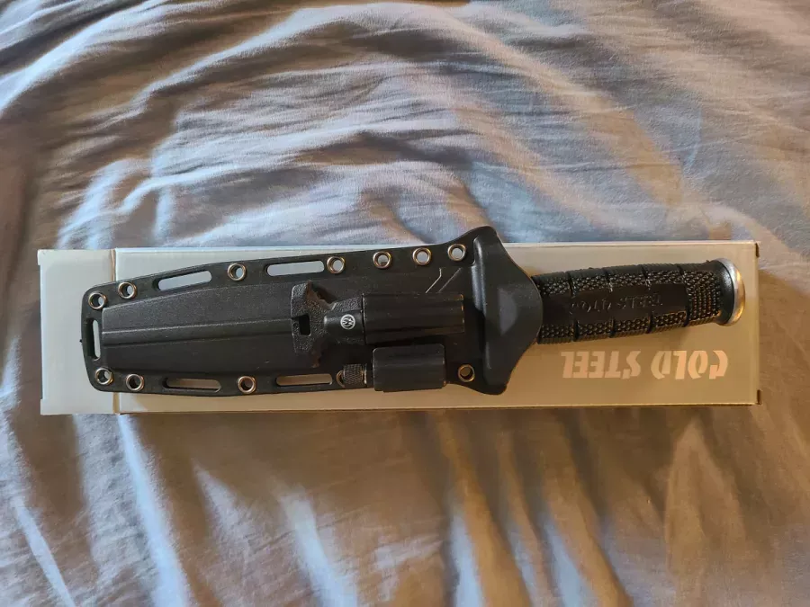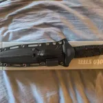 Nib , blade is 7 inches, rubber handle is 4.5 inches, little over 12 inches with sheath. Polymer sheath comes fitted with a fire start striker stick and tiny led flashlight as seen in pictures. Comes in box, has belt clip or use the utility holes all over sheath to tie it on how you like.