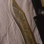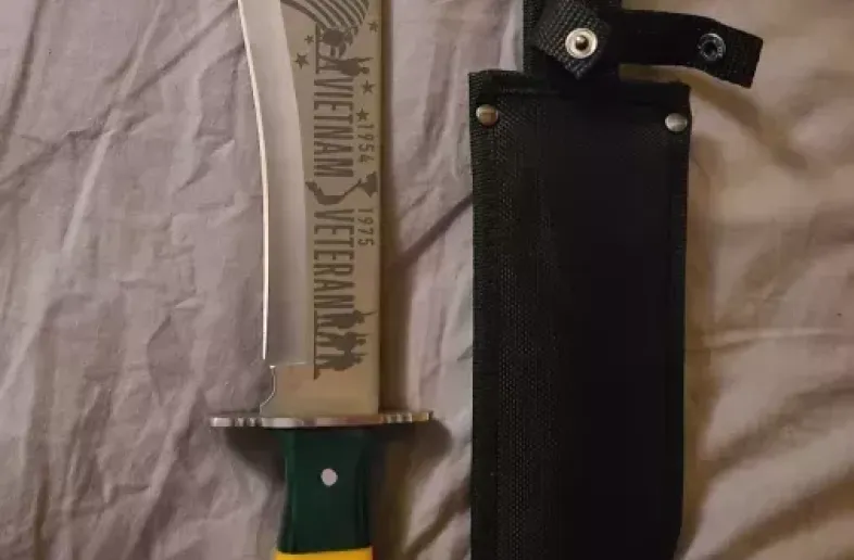 9 inch full tang blade, green wood handle with yellow and red bands (Feels like pool ball material bands) not sure the stainless steel type but is sharp and seems high carbon. solid, thick and good weight. I don't have a box but comes with nylon sheath as seen in pictures. Hero outdoors sells exact one before shipping and tax for 94$.