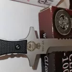 This knife is from the original run and is numbers matching. The knife is in new condition, the box does show some light wear from storage and unfortunately, the baggie of attachment fittings for the sheath is missing.