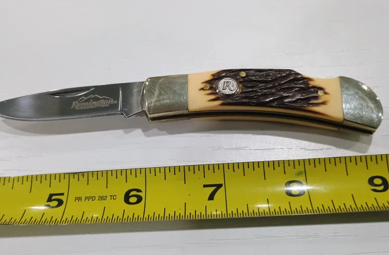 Stagalon handle with nickel silver bolsters, brass liners / pins and round "R" Remington shield. Locks up tight--no rock or wobble. Blade 2 3/8", Closed 3 ", OAL 5 1/4". Excellent condition.