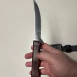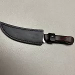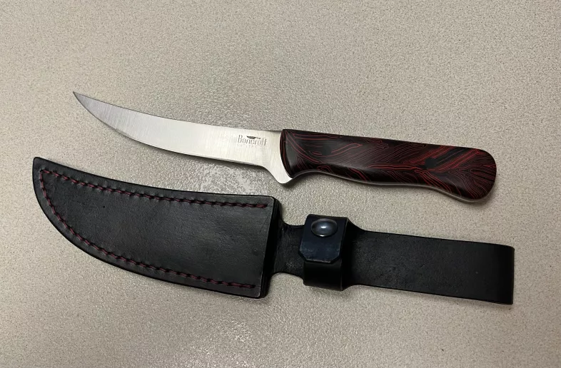 Custom made full tang curved boning knife from Bancroft Cutlery. Made out of AEB-L stainless steel. Scales are red micarta with black pins. Finished with a beautiful dark leather sheath (left hand) with snap button and red stitching.