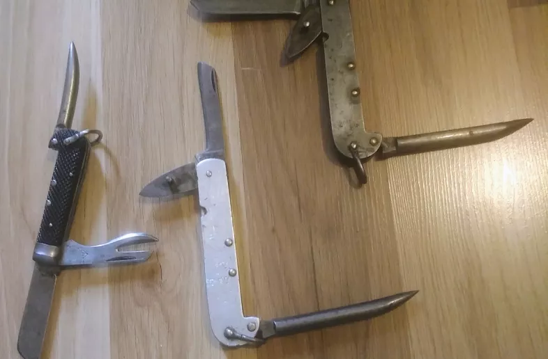 I have three (3) good condition folding knives, referred often as Spike Knives or Rigger's Knives or even Marine Utility Knives. The price posted is for all three (3) knives. That's good value at $50.00 each!