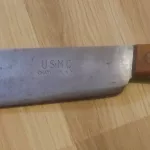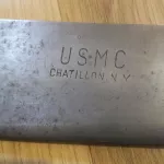 It has a full tang hand forged carbon steel blade stamped "USMC CHATILLON. NY" which is one of three U.S. manufacturers of these. The spine measures approximately 1/4".
