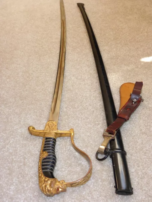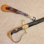 German officer’s sword, WWII, lion head, Ornate grip and crossguard with Nazi eagle insignia. VG+ overall condition. Blade is excellent, straight, original plating does not show any flaking or marks, original leather scabbard stopper at guard, original paint on scabbard and in VG condition straight, no dents. Grip is VG condition with some Verdi gris present. Comes with uncommon leather hanger and backing piece.