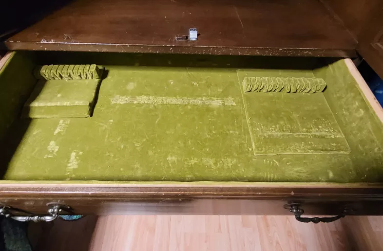 Free cabinet locks underneath padded drawer and display cabinet