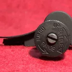 Features the redesigned, removable elevation cap on the pinion used up to the end of World War 2. It allows the user to find the desired elevation setting for a specific range and then re-attach it to the pinion at the correct graduation. These caps feature an arrow with the words “BATTLE RANGE” marked on the side, pointing to the 300 yard mark.