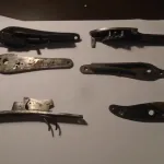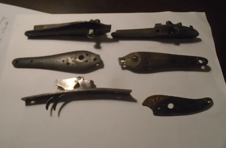 Upper 2 locks function as they should set trigger function. Don't know what they came off upper left lock marked S K Weston, right lock not marked. Both upper locks 4.5" long 1-1 1/2 high.