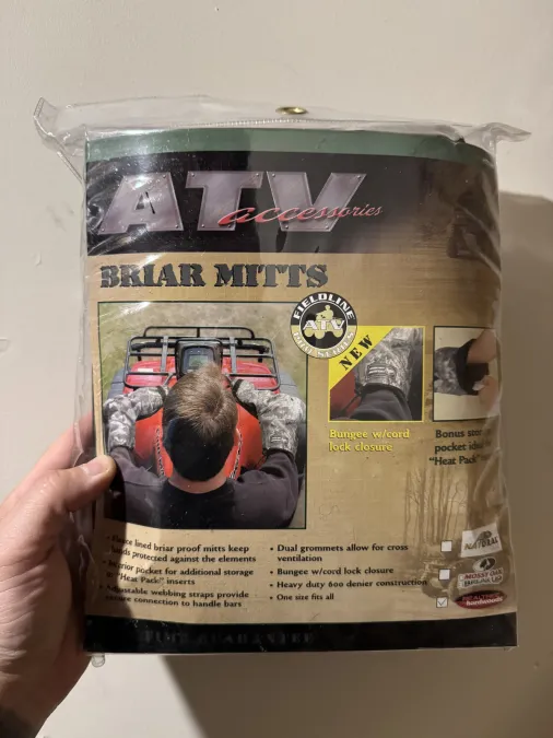AtV/Snowmobile handlebar muffs. BNIB. Package says lifetime guarantee. Realtree Hardwoods camo. Even has a pocket for handwarmers inside. $25