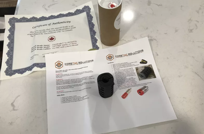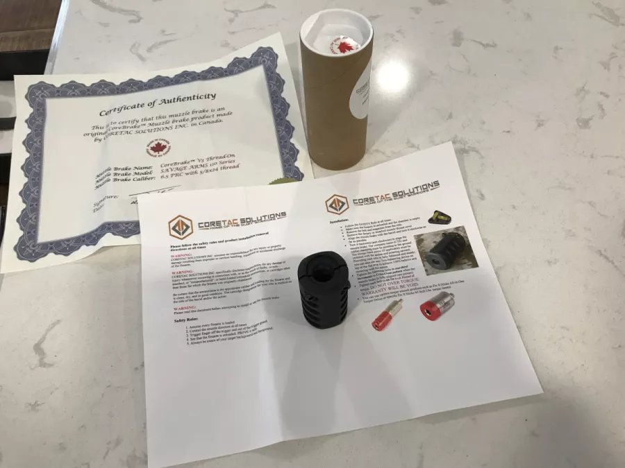Coretac solutions thread on muzzle brake for 6.5 PRC WITH 5/8x24 thread new never used.comes with certificate of authenticity and mounting instructions.no trades and buyer is responsible for cost of shipping.