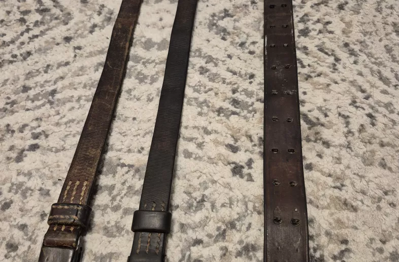 Ive got here some really nice untouche Slings. First two are WW2 German slings in great usable condition both have dated keepers 1940 and 1944 looking for 225$ each plus shipping and the other is a 1907 Sling in top notch condition amongst the nicest ive seen great leather no cracking , supple and hasn't been oiled like so many there are markings but I can't make them out, looking for 250$ plus shipping on that one, many more detailed pictures if interested