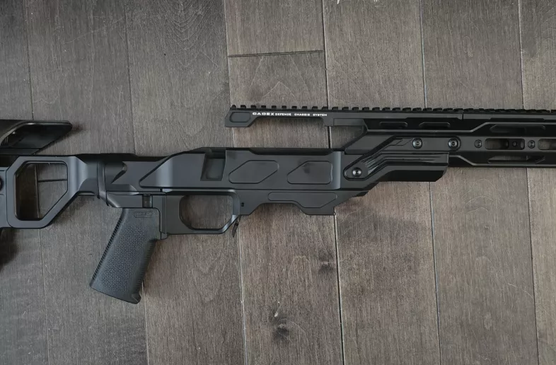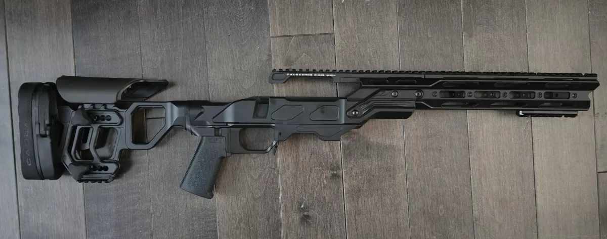 This is the Cadex Field Tactical chassis, this one fits all standard Remington 700SA profile actions (standard 6-48 top rail screws). The top rail will NOT fit any action that has proprietary top rail (like the Pristine Action), but it will fit in the chassis
