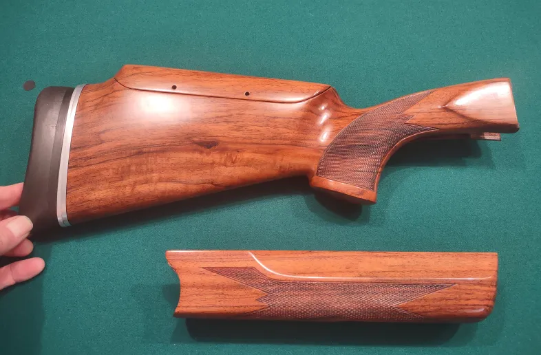 k80 lowrib trap or sporter. Right hand zero cast approx 14 1/4" lop with adjustable parallel comb. Extrafancy English walnut and matching forend with rosettes. In pristene condition, not a mark or crack or blemish anywhere, as new. 2750.00 obo. This stockset new is 3650.00 US dollars from Wenig.