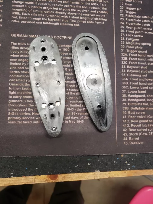 Plastic butt plate for Tikka Model 70 series and similar shotguns. 2 minor hairline cracks on the inside, does not affect serviceability.