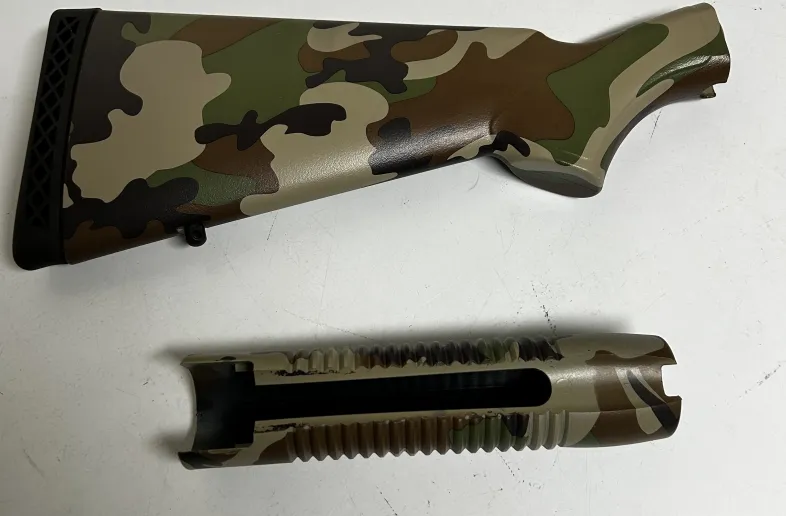 Factory Woodland Camouflage pattern stock and forend. Brand new take off from Mossberg 590 - 12 gauge. Pick up cash only. Thanks
