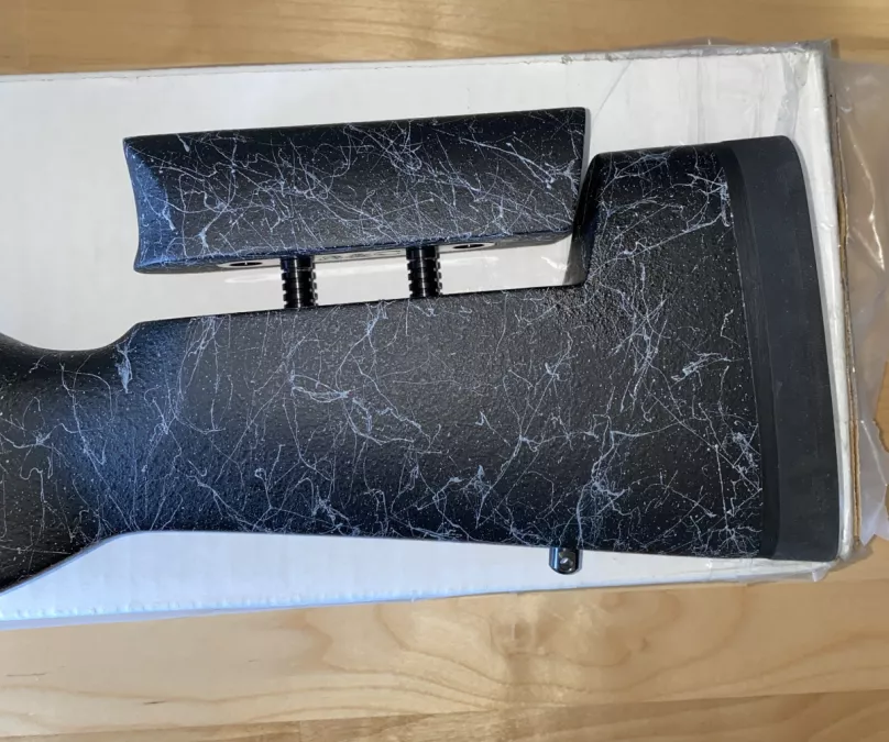 - Adjustable cheek piece .5 inch below boreline in down position with 1.125 inch total upward adjustment