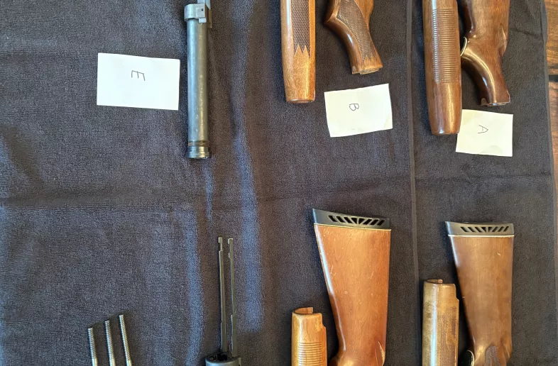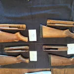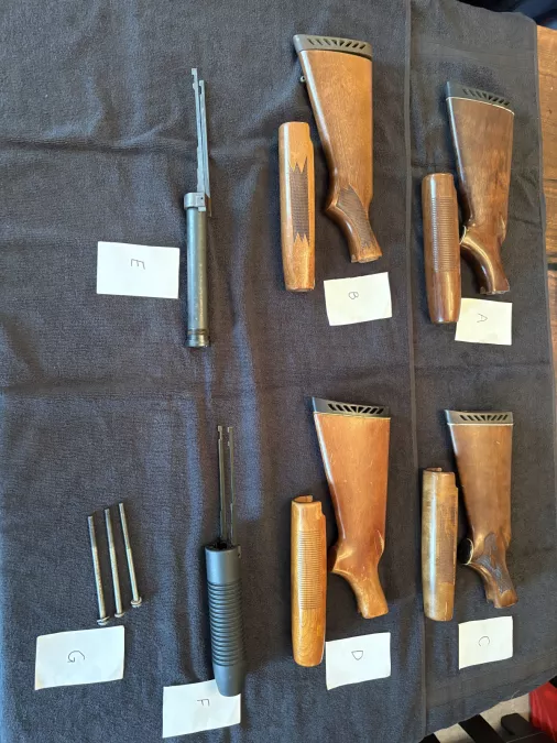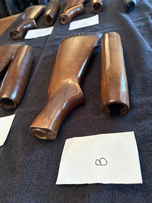NO TRADES PLEASE. All parts are from Mossberg 500 12 gauge pump actions with 2 3/4 and 3 inch chambers. These sets would be nice upgrades over the synthetic stocks.