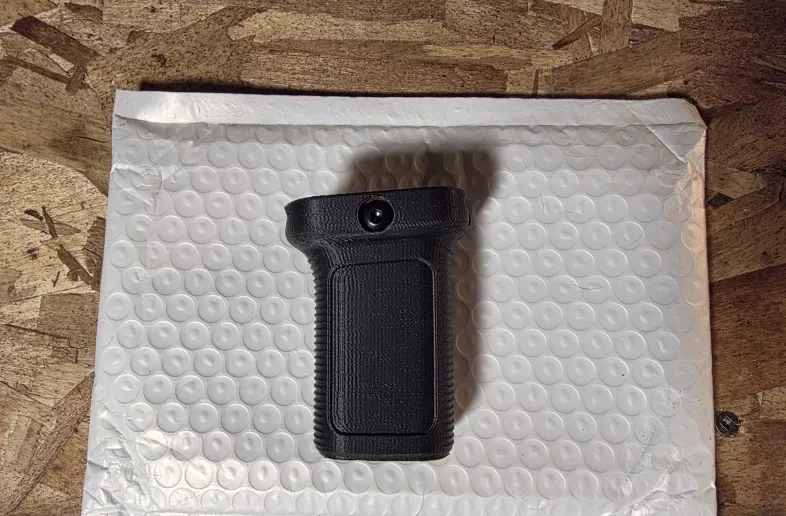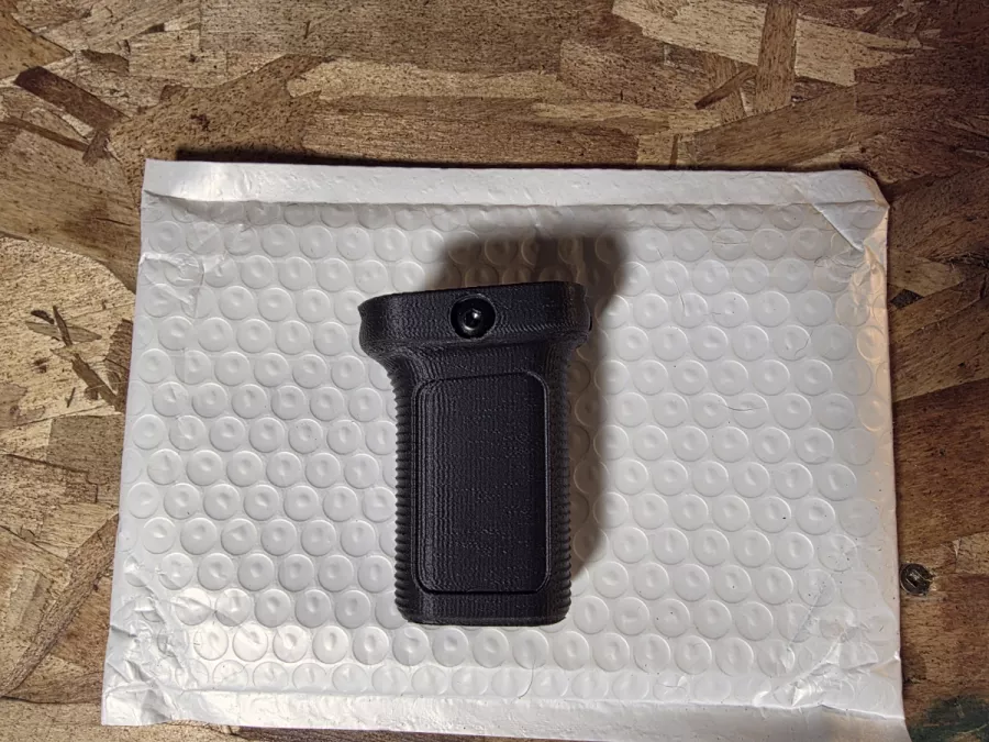 This is a 3d printed foregrip with an m5 screw and nut hardware that can attach to picatinny rails.
