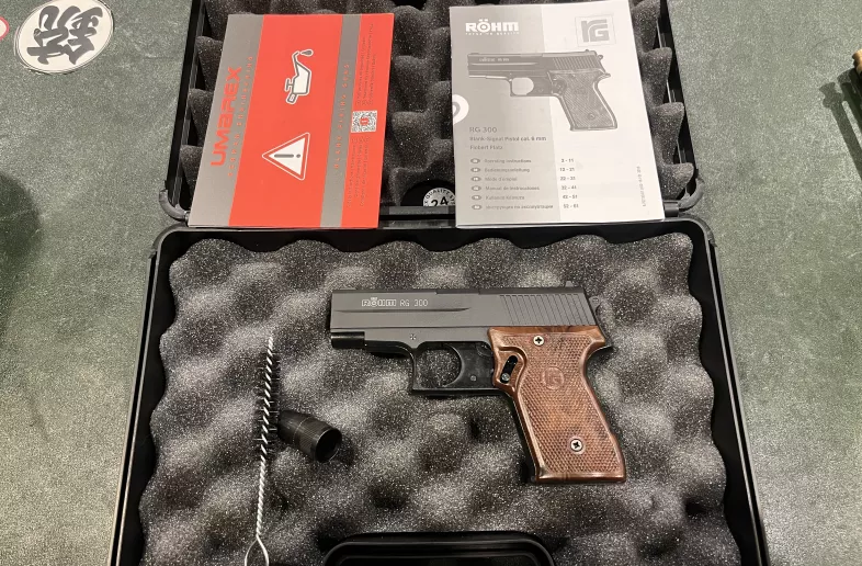 Röhm RG 300 blank-signal pistol chambered in 6mm Flobert, crafted in Germany and presented with its complete factory kit. The RG 300 features a compact semi-auto design with a steel-reinforced slide, single-stack magazine, and classic Röhm ergonomics with checkered wood-pattern grips.