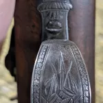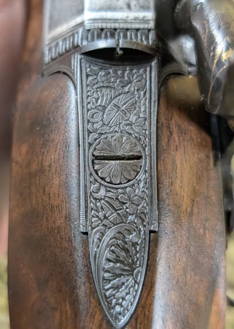 The engraving is extremely fine, intricate and skilled. It would have taken many dozens of hours to complete and it was all done by hand. The engraving features drums, banners and spears, floral patterns, sunbursts on the base plate and lock, and a pineapple in the front of the trigger guard, which symbolizes wealth and status. Because this gun is a percussion conversion of the original flintlock mechanism the percussion hammer is engraved in a different style by a different engraver in a more simple floral and fish mouth style of engraving with gold inlay. Every screw is engraved to look like a flower and the escutcheons are also each engraved like a wreath. Overall there is a lot of fine detail with some simpler and less detailed later additions on the percussion mechanism and one spot on the side plate.