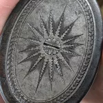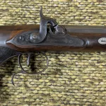 The gun features gold inlay on the hammer which largely worn away. There is silver inlay on the outside of the breach, and a sterling silver wreath styled band wrapped around the base of the grip and a sliver bead front sight. The ramrod tip (which is a replacement) is silver plated brass, so too are the front stock cap near the muzzle, the rod pipe, cross key, and escutcheon around it are too. The grip baseplate is silver plated steel.