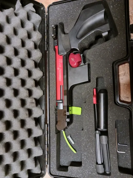 Want to compete? Here's your ticket. Hammerli SP-20 Olympic Style .22 pistol. It has the RRS, recoil reduction system similar to a Pardini. Shoots very flat and runs very reliably. Comes with two grip modules for different size hands to allow for a comfortable grip. Also comes with a complete .32 S&W Long conversion kit which allows you to compete in the centerfire events.