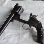 On the block is very nice mechanically excellent S&W New Mod.#3 in the popular .44 Russian caliber. There is still bluing in the protected areas with the balance faded to a nice patina and even evidence of case colour hardening still on the hammer. The bore and chambers show clear evidence of old black powder fouling but the rifling is still very good. There is no sign of rust or damage and the grips are very good with the name of an old owner scratched inside them (Charles Stalsby, Oakdale LA). The pistol comes with a very nice vintage holster. This is an early 4 digit serial numbered pistol with all the numbers matching (frame, cylinder, and barrel latch). It should be an excellent shooter.