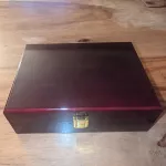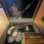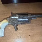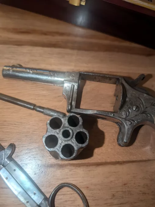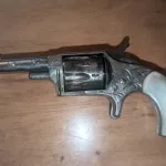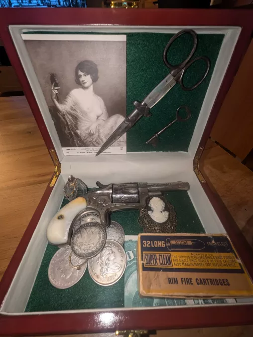 MOP grips and factory engraved. Comes in a lacquered box with antique MOP bodice dagger, an old postcard. Costume jewelry and some reproduction U.S. dollar coins make a kind of cradle for the revolver.
