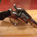 This one is in excellent condition. The nickel plating is intact with no flaking. The gun is marked "44" on the side. The cylinder shows the pre-1893 Belgian proof mark and post 1878 inspection marks. There are the initial "MV" stamped on the frame, which the mark of the foundry. The action is accurate and strong, and the cylinder indexes and locks properly without play. The bore of the 2 1/2-inch barrel is excellent and bright, with sharp rifling. The walnut grips are excellent and undamaged, with no wear. SN 5, excellent overall.